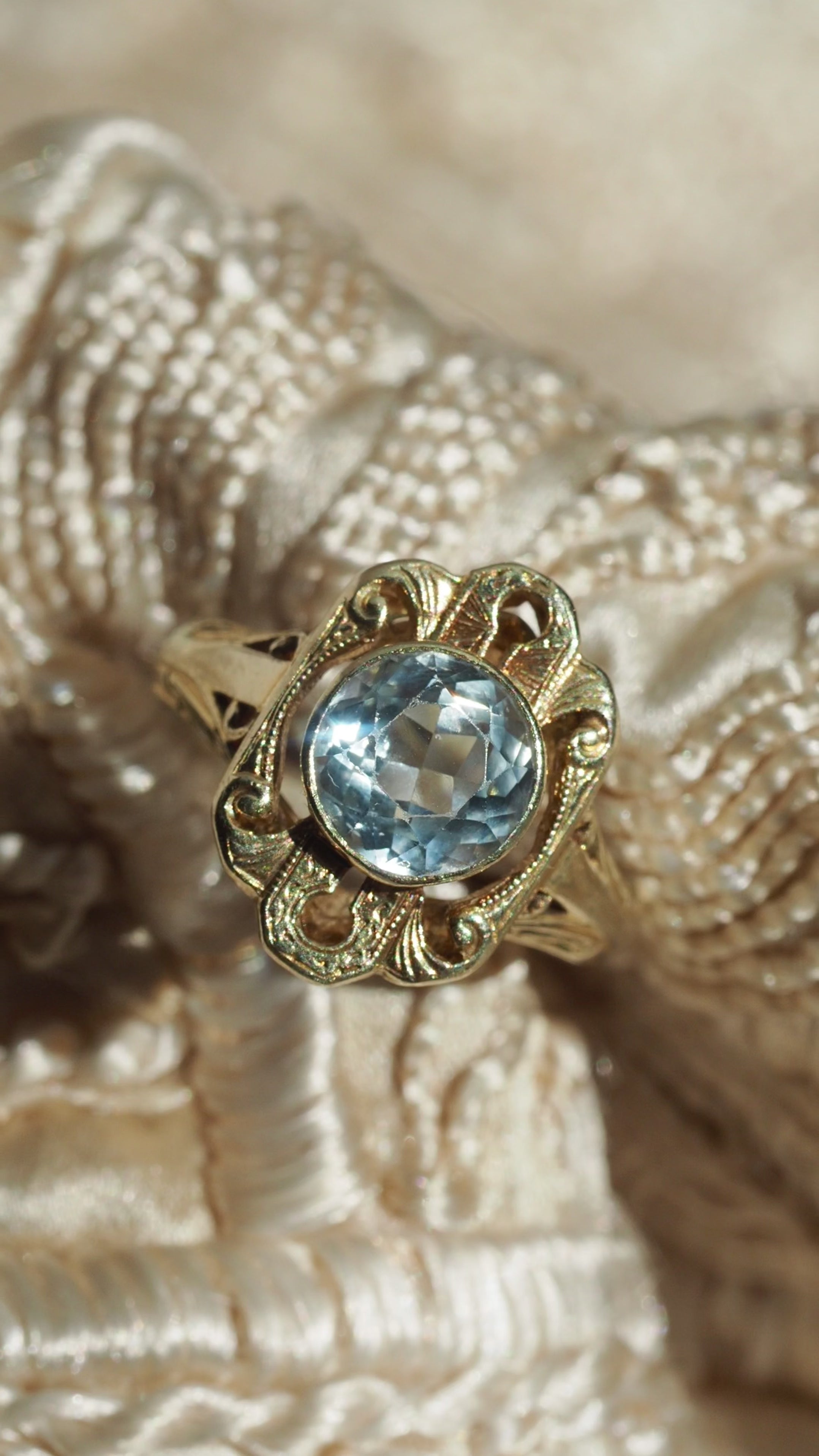 This ethereal Art Deco era ring features a sizable aquamarine with outstanding faceting that brings a sparkling watery shimmer to the pale blue gem. The mounting has been made of soft yellow gold with wonderful cutouts, engravings and filigree. This piece has a confident yet tender presence and a color palette that suits every season.