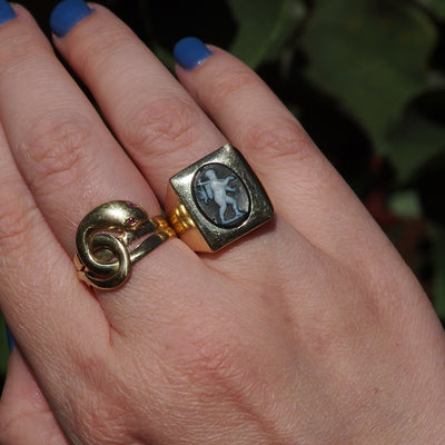 An outstanding antique banded agate has been carved to show a tromping cherub carrying a bird upon a his shoulder. The milky white figure stands in stark contrast to the black vignette, with expressive yet precise details which utterly captivate. The intaglio predates the ring, which is itself a vintage 14k gold squared signet setting weighing a whopping 11.3g.