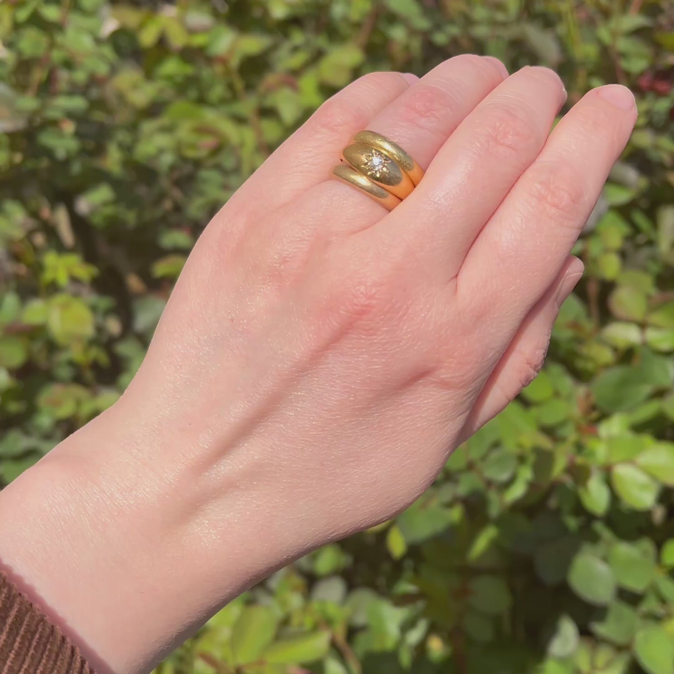 This beloved starburst flush set ring hosts a twinkling old mine cut diamond huddled inside a broad low dome of 18k gold. Each engraved starburst is wide and pronounced so as to embellish the diamond setting with a graphic frame. With a full set of hallmarks, we can date this antique English piece to Birmingham c. 1911-12. The wearability and versatility of this style is unmatched, which can function as a wedding band or an engagement ring.