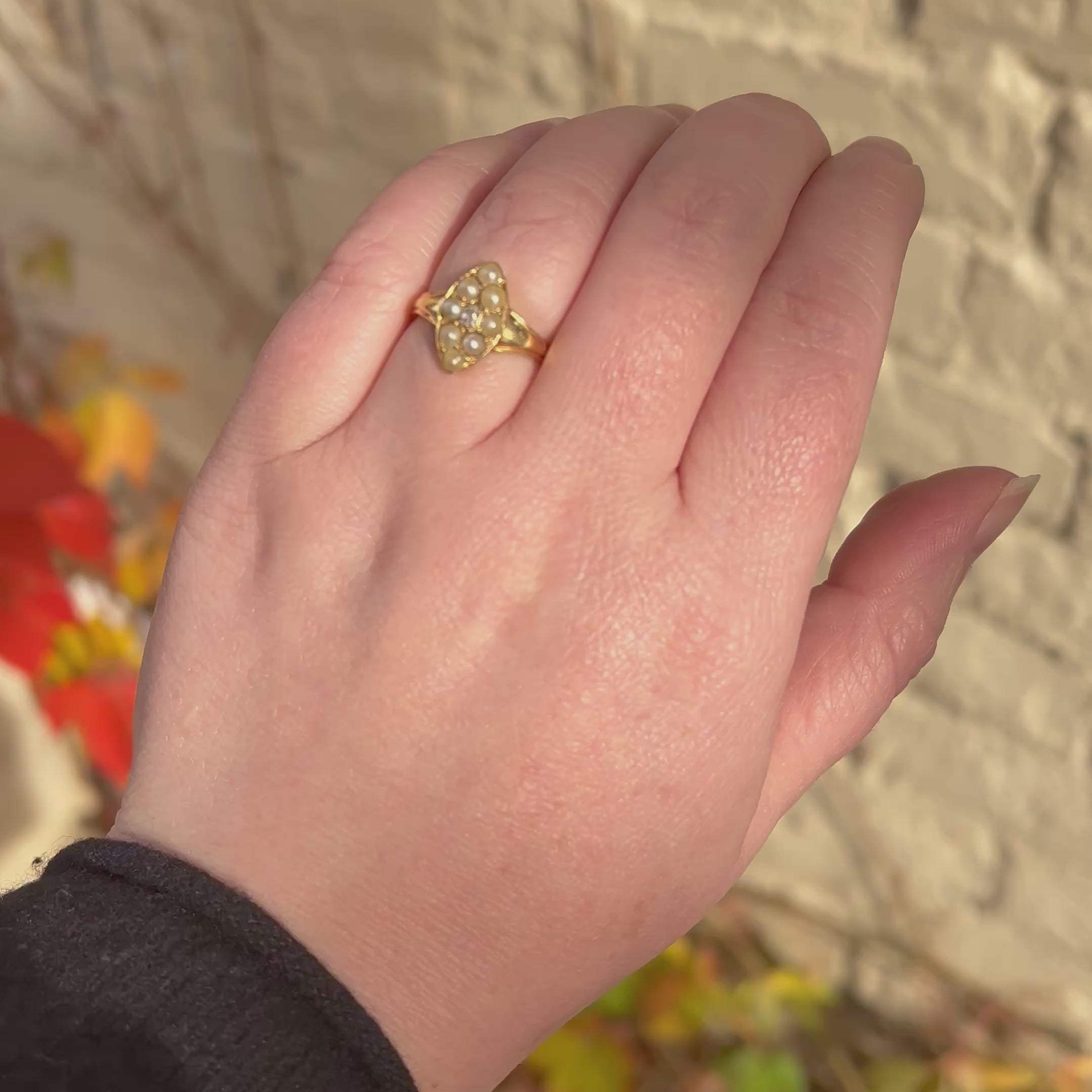 Antique Early Victorian Peruzzi Diamond Natural Seed Pearl 18k Gold Navette Ring