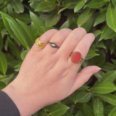 A vibrant slab of carnelian gleams from a bezel setting in this antique 8k gold signet ring. Thought to bring courage and creativity to the wearer, this rich orangey red agate has a slight transparency which adds a glowing quality to its depths. The hearty triple ridged wide shoulder bring an energetic yet understated quality to this timeless and powerful piece.