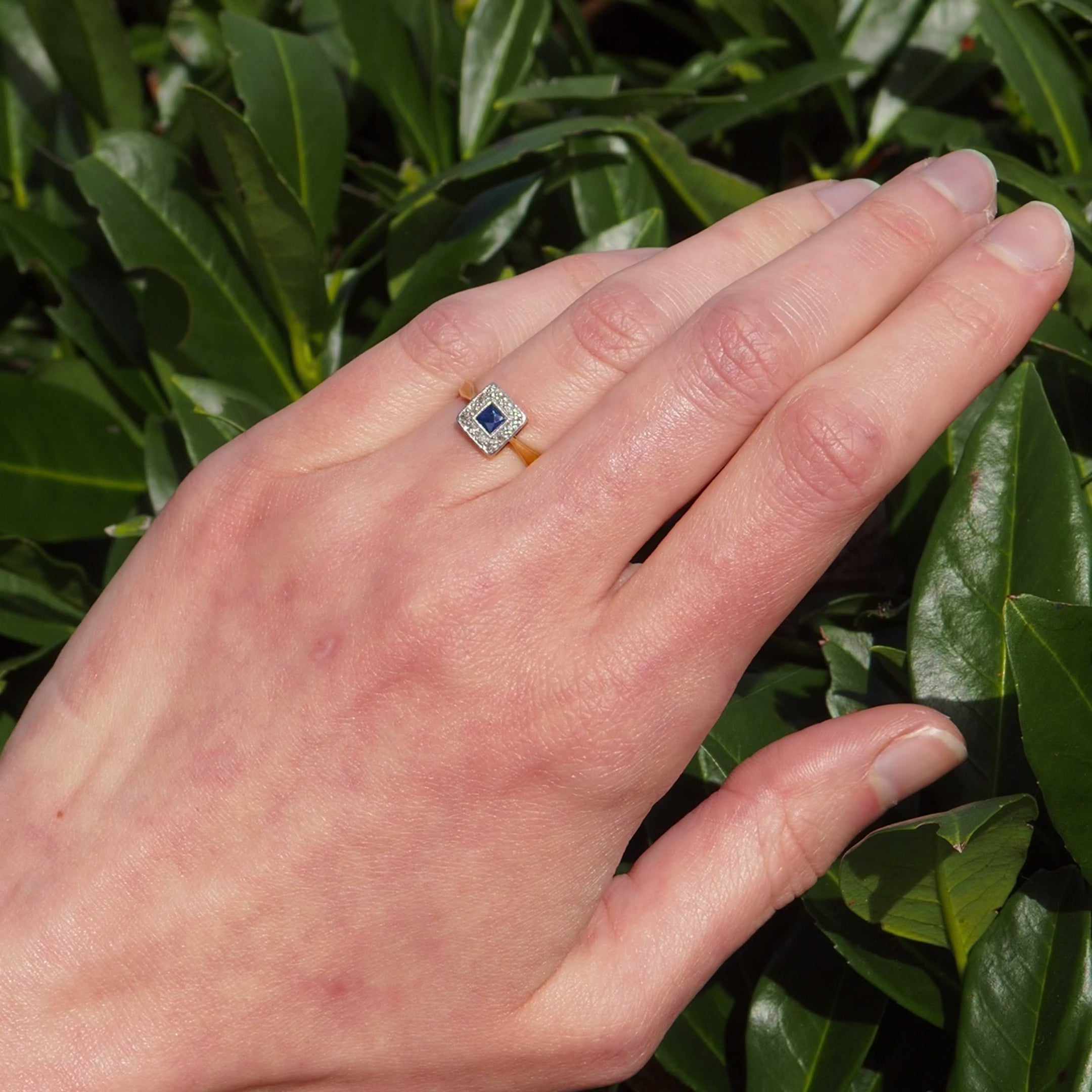 This pleasing antique English ring hosts a pool of sapphire amidst a glistening frame of platinum and diamonds.