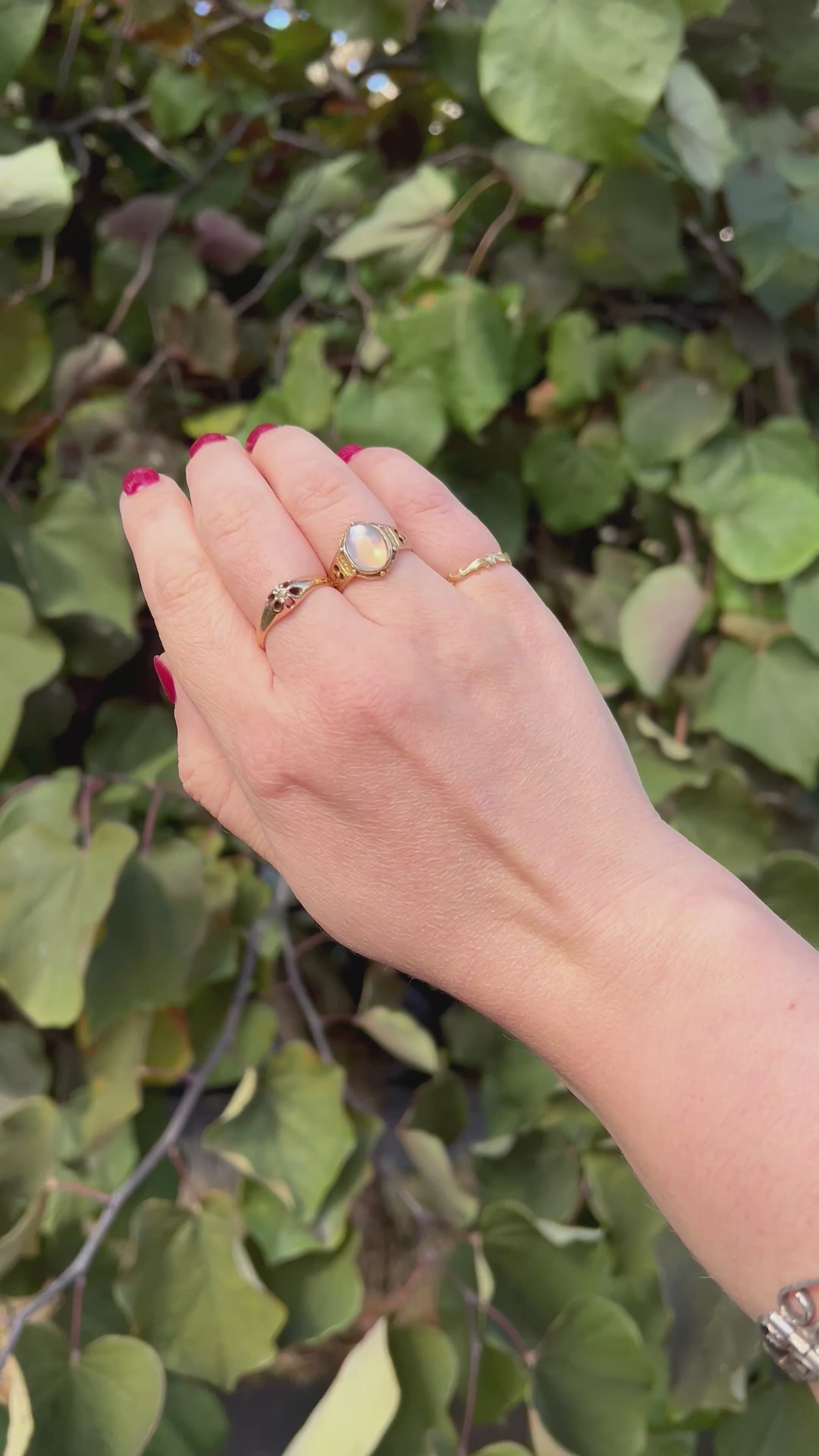 We're over the moon for this antique c. 1868 English moonstone ring! The gem itself has a magical glow, and the closed back brings a warm golden gleam to its aduralscence. The detailing in the gold is just to die for- from the tiny laurel sprigs surrounding the bezel to the flower cutouts in the shoulders, which look a bit like trilliums!