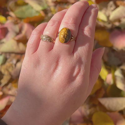 A tiger's eye cabochon has been carved to represent Zeus in this practically holographic antique Victorian ring. His commanding gaze is all the more beguiling for the way it is illuminated with the slightest movement. It rests in a sturdy 10k gold mounting with a closed back that is very comfortable and perfectly arched to fit the finger.