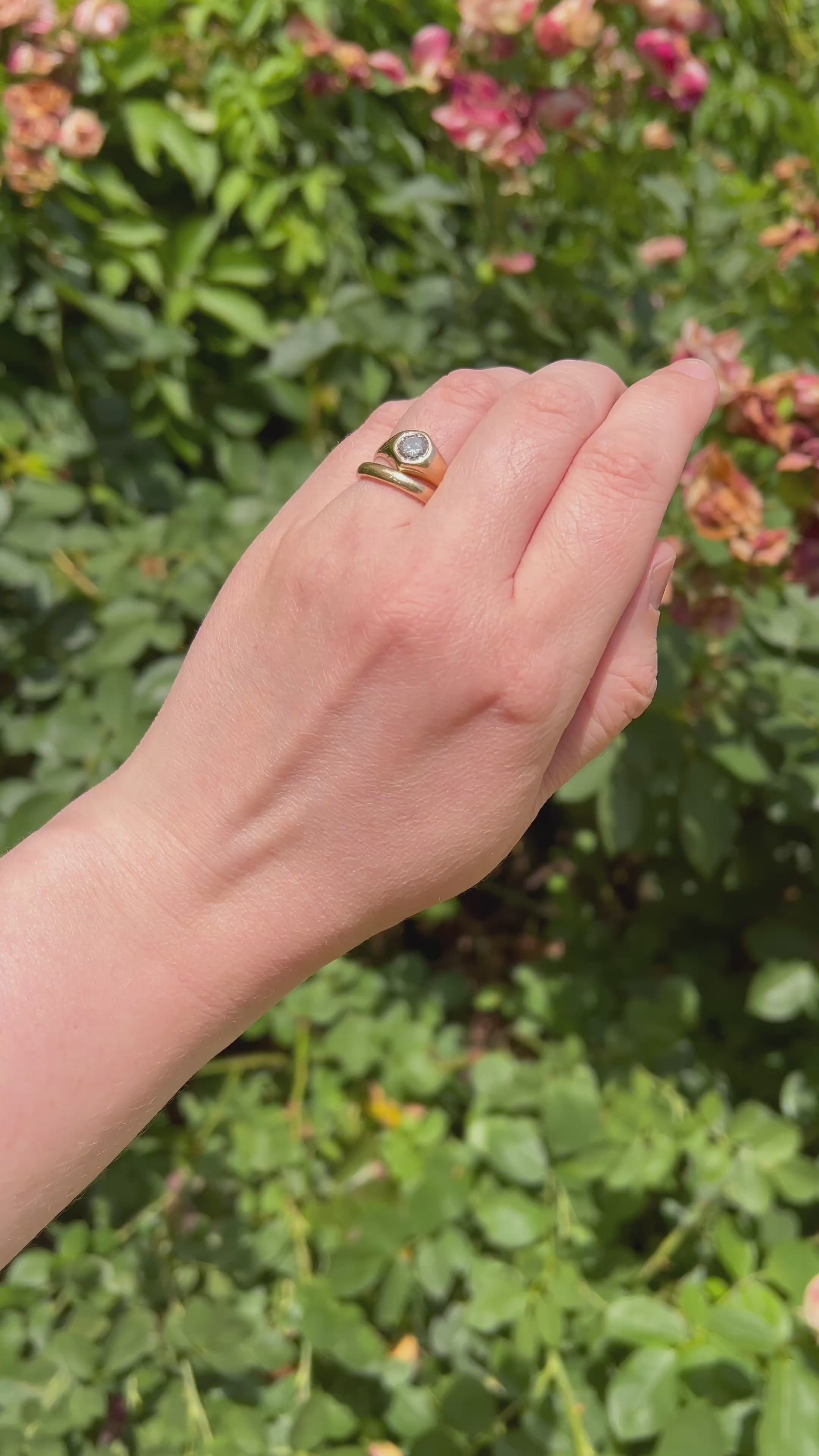 This confident and robust vintage ring holds a three quarter carat round brilliant cut diamond sunken like a pool atop a mounting of 10k gold. The north and south sides of the ring face are slightly peaked, adding a subtle dynamic quality to this twist on one of our favorite styles.