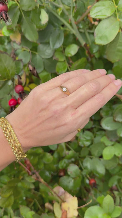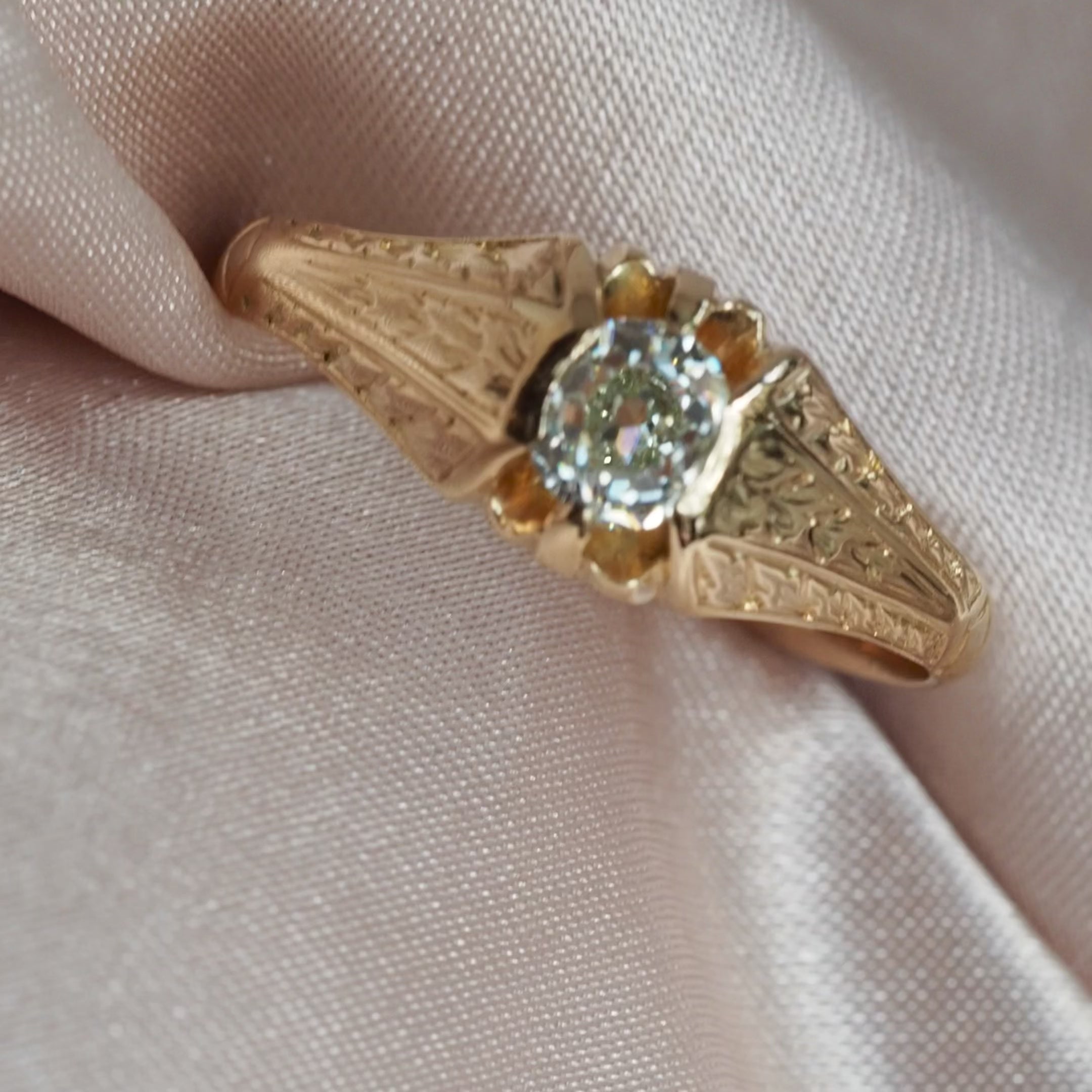 This spectacular antique engagement ring came to the shop from a recent trip to Prague. It features a vivacious oval old mine cut diamond in a unique mounting of 14k gold with an abundance of engravings. The flush mounting on the east and west sides of the diamond keep it safe and secure, while the airy prong setting at the top and bottom allow light to flood the gem. This gorgeous piece is a relic of the Art Nouveau or Secession style that flourished in Central Europe around the turn of the 20th century.