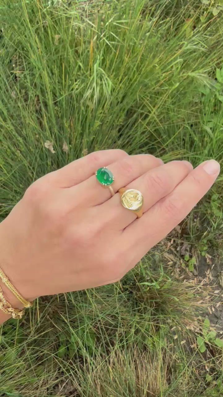 A verdant emerald weighing 2.7ct steals the show in this delectable velvety 14k gold ring. Four sets of double prongs discreetly peek over the edges of the seemingly bottomless gem, which is upheld by a tall pedestal of a mounting. A fully round shank completes the piece with a distinctly contemporary feel.