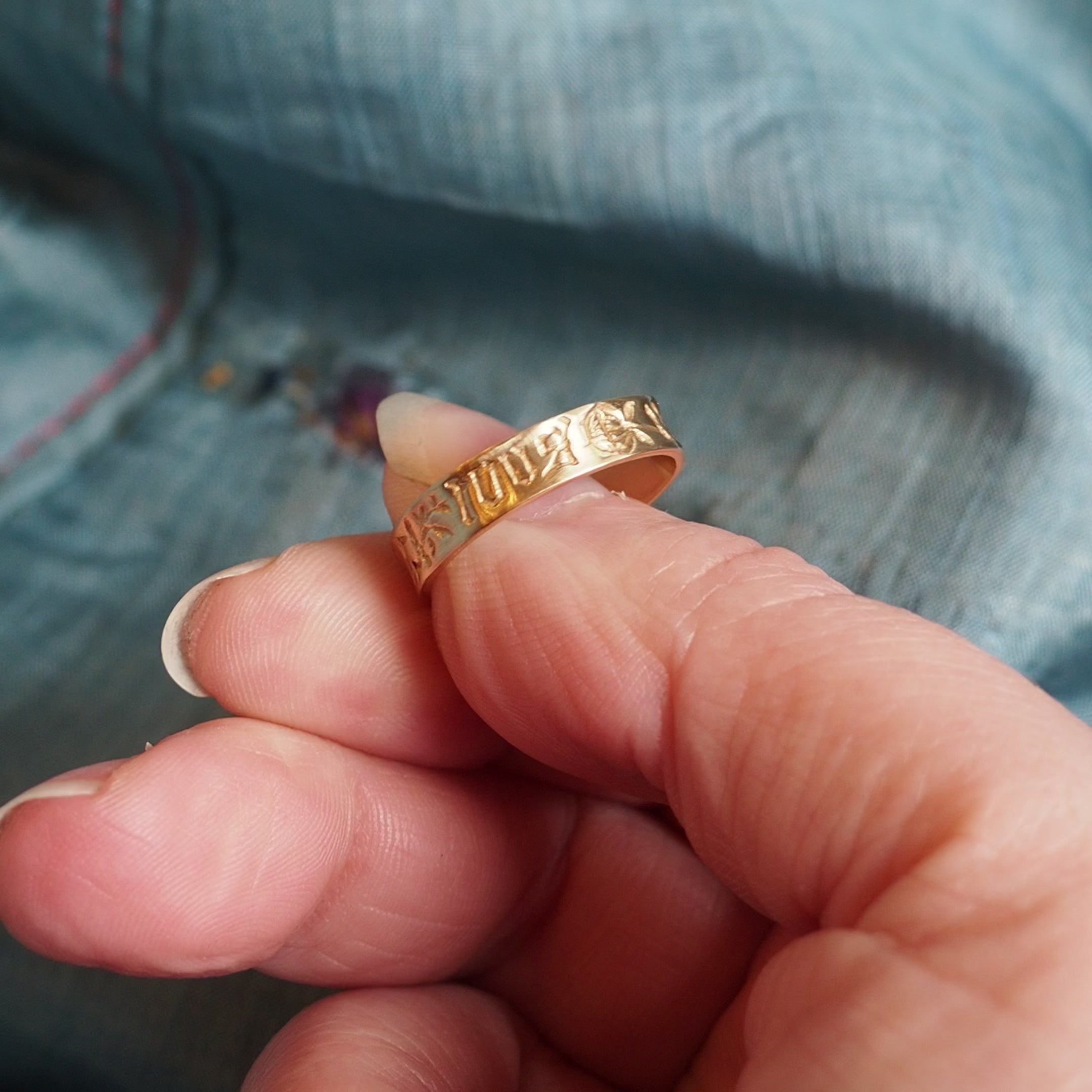This vintage 14k posy gold ring has a velvety surface engraved with a French phrase "por tous itours" or "for all times" in old calligraphic script, with little folky florals tucked between each word. It would make a meaningful wedding band or token of love.