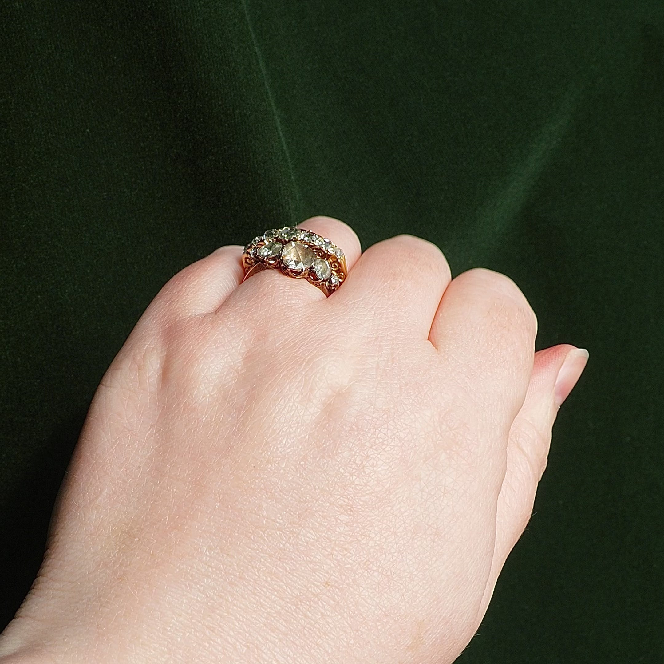 Lauded as the "most romantic diamond cut," antique rose cut diamond offer tender flashes of light from their shallow depths. The foil backing behind the gems was once meant to reflect more light, yet with age it acquires a patina which adds a shadowy quality to the flat-backed diamonds. Little prongs tuck them neatly into their housing, with almost the slightest bezel curved around each diamond. The irregularity amidst the five diamonds is just spectacular, and all of this is mounted upon a wide square-edged band of rosey 18k gold.