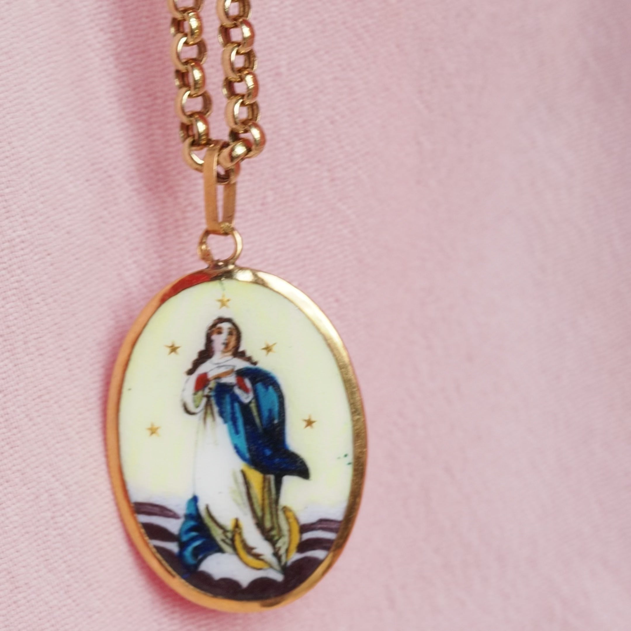 Antique Portuguese 19k Gold and Porcelain Mary Pendant