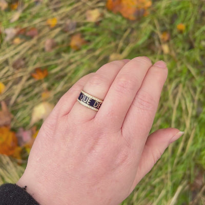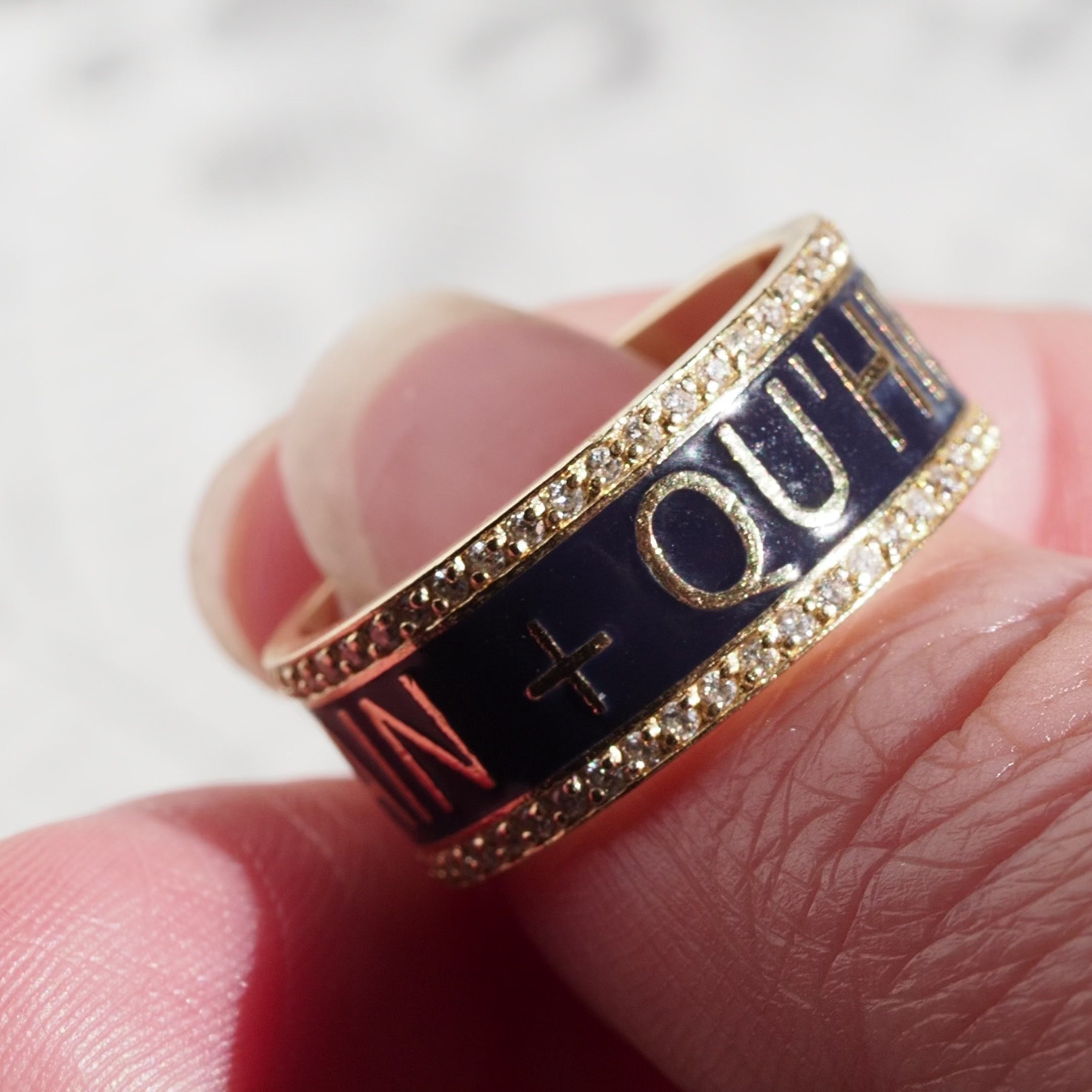 “Each day I love you more, today more than yesterday and less than tomorrow.” This beautiful passage, written by Rosemonde Gerard, is an excerpt from a poem she wrote for her husband in 1889. “More than yesterday, less than tomorrow” was popularized by the French jeweler Alphonse Augis in his iconic "Medaille d'amour" pendants. This stunning piece comes from this romantic lineage of jewelry, here represented in arguably the most romantic form: a ring, representing eternal love. The words and symbols stand out in gold amidst midnight blue enamel. Rows of diamonds frame either side of the thick band, contrasting dramatically with the nearly pristine dark enamel.