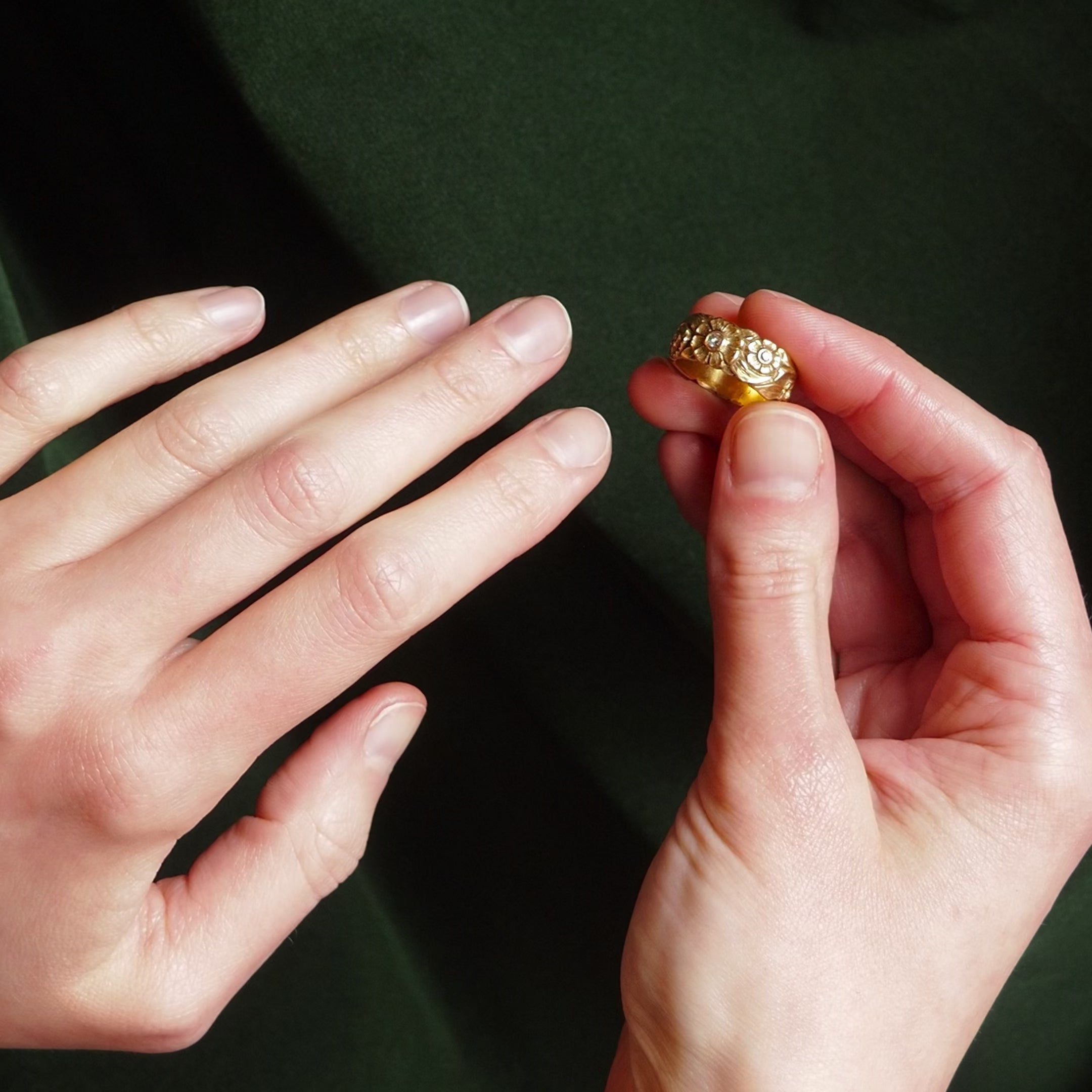 This wide antique band is a wreath of sumptuous flowers deeply chased into thick 14k gold. The ring’s face is embellished with a trilogy of handcut diamonds bezel set in the middle of three blooms. The depth in the engravings is just unparalleled, with so much attention given to the flowers- all of which are beautifully accented with thick leaves and grass that bend and tuck between them.