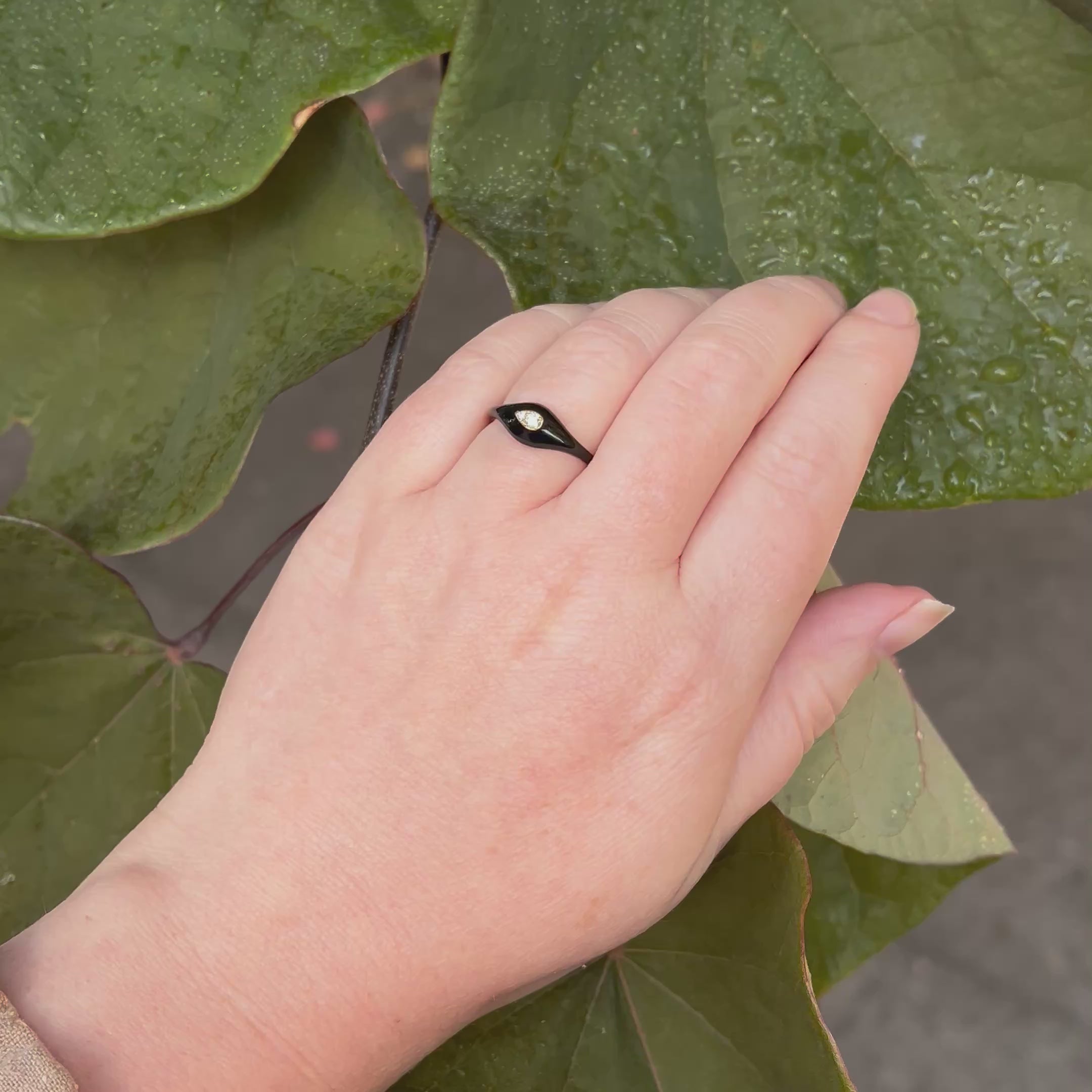 This breathtaking ring is covered completely in stark black enamel with two diamonds in an east-west teardrop shape at the height of the the dome. The plump shape atop conjures an eye, and the asymmetry bolsters the fascinating yet refined design. The shoulders taper dramatically into a slender band made taller by the pristine and masterful enamel work.