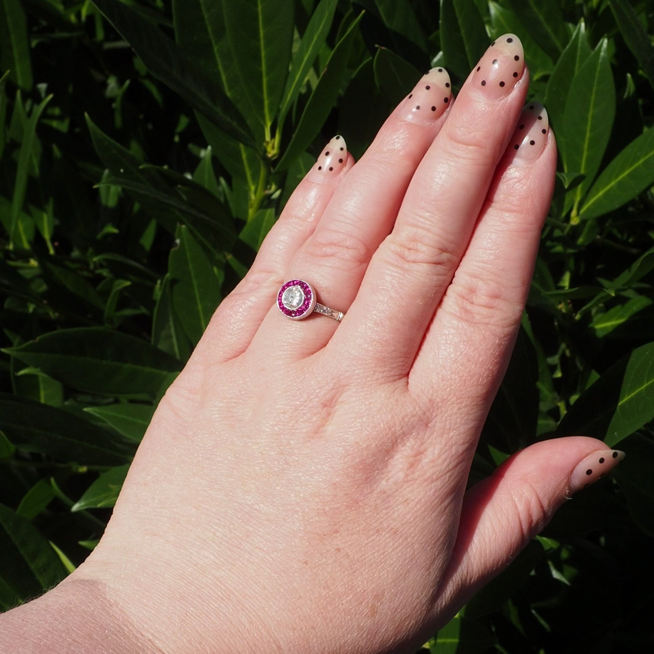 This dazzling vintage Art Deco style engagement ring captivates with a target design comprised of a half carat round brilliant cut diamond surrounded by French cut natural rubies. The weighty platinum mounting features a shapely scalloped undergallery. Each shoulder holds a pair of diamonds in milgrain embellished settings. Altogether, this piece brings an intoxicating degree of punchy sparkle in a paired down Deco style perfect for someone seeking an engagement ring with a pop of color.