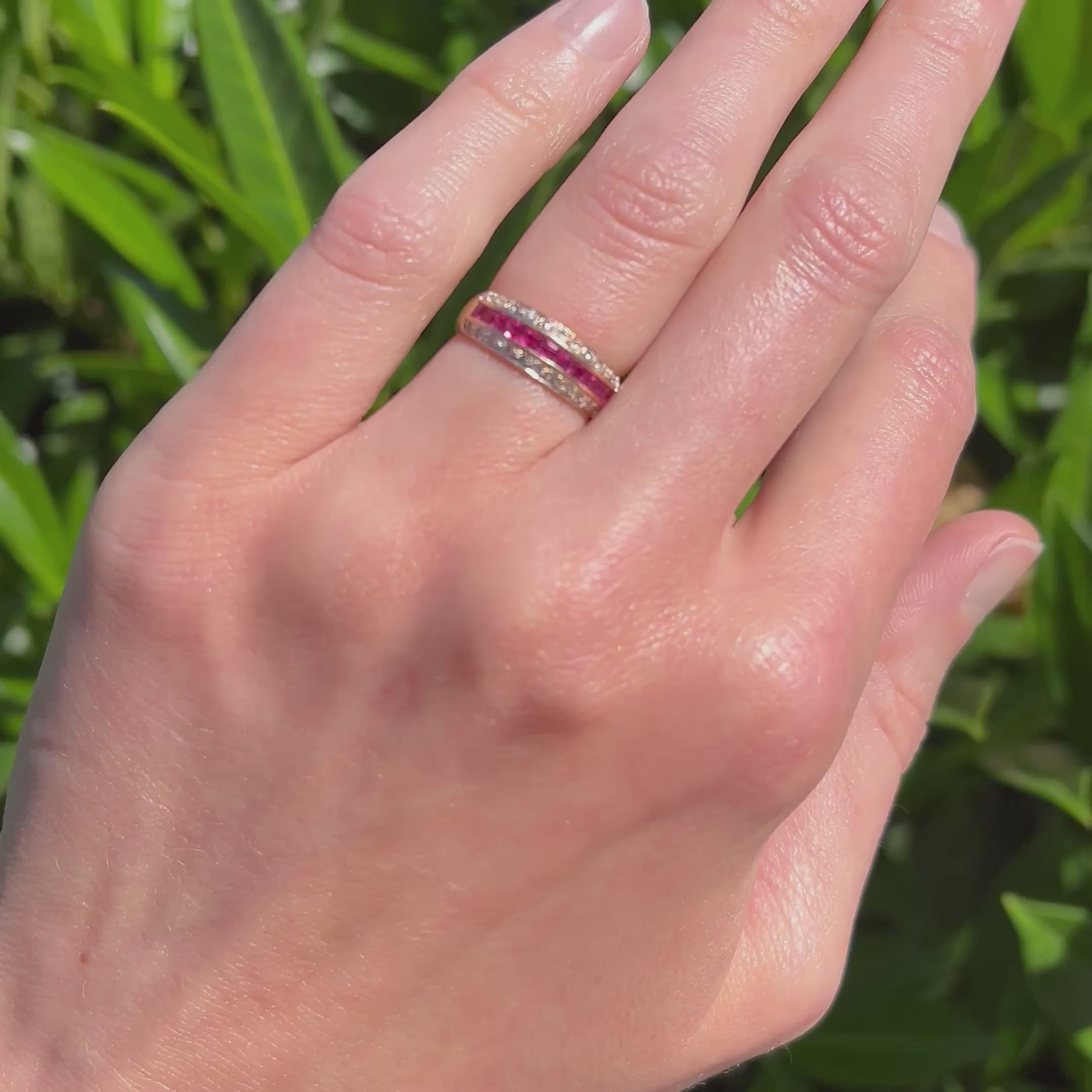 This effervescent vintage ring features a stripe of channel set natural princess cut rubies sandwiched between two rows of diamonds. The gems are all tightly huddled together over a thick domed mounting of 14k yellow gold. This little piece packs a punch and is ready to bring a succinct pop of color and texture to your daily lineup.