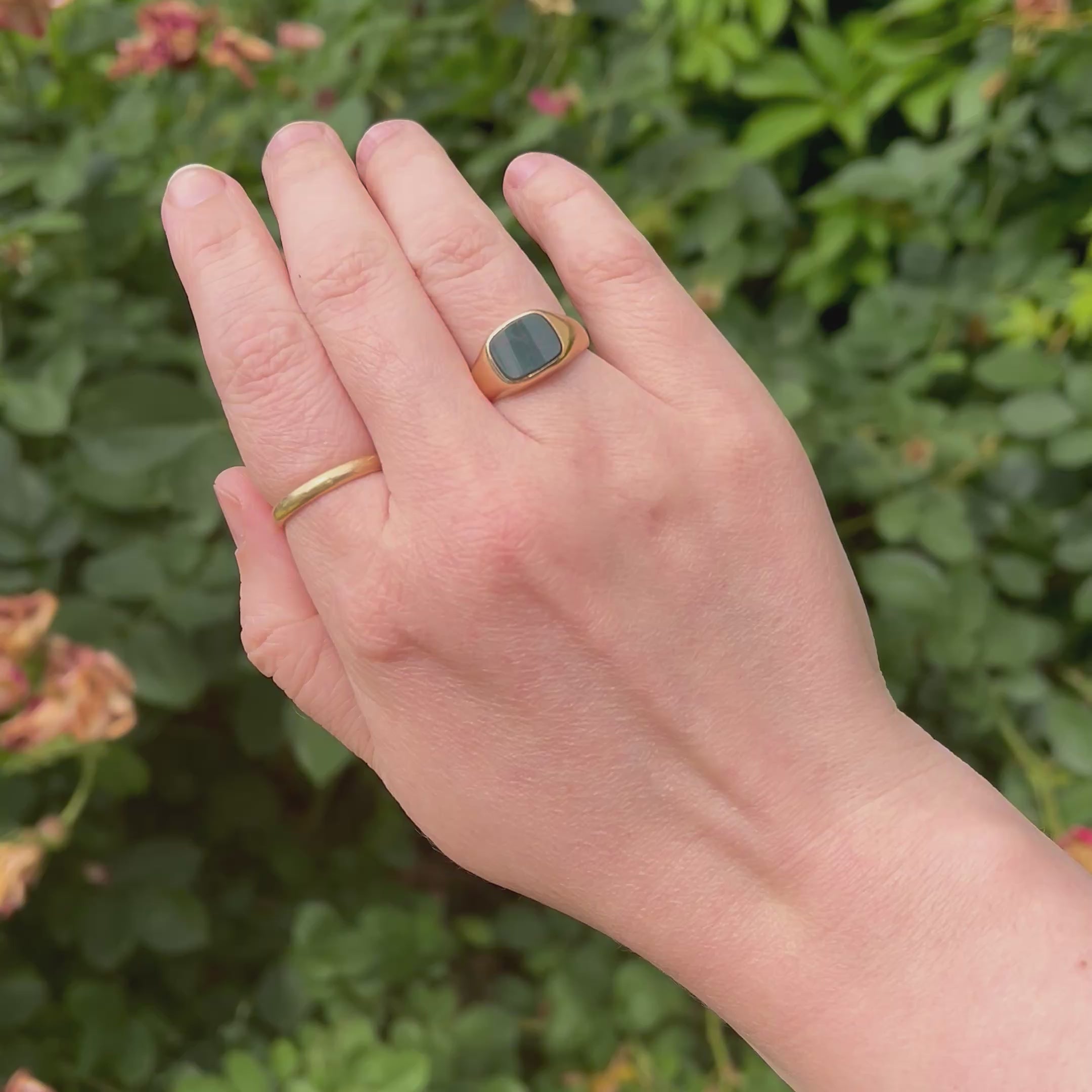 This pleasing vintage signet ring hosts a curved bloodstone nestled into a sumptuous mounting of 14k gold. It's beautifully made, with a solid backside that feels comforting and substantial against the finger.