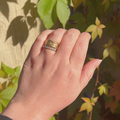 This buttery vintage 14k gold ring has such a unique combination of florals and patterns. A lattice is overlaid upon finer linear texturing with daisies dolloped atop, all framed in curvy flourishes on the edges. It has been lovingly worn and feels so smooth on the finger. We'd love to see this beauty serve as a wedding band!
