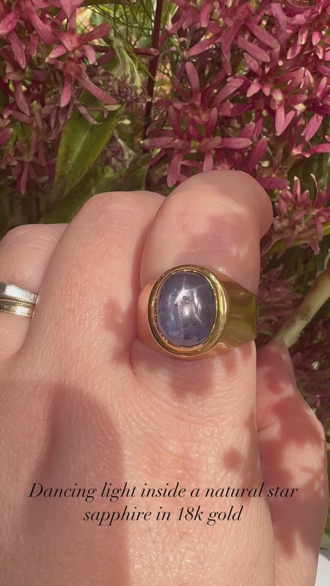 The natural star sapphire cabochon in this ring is so absorbing that it feels like a world unto itself! It practically appears to have its own weather system, the way that it tosses and refracts light through its tall dome. It has been bezel set within an aptly substantial wide band of 18k gold. This ring is a real whopper, and none of us can look away when it's near!