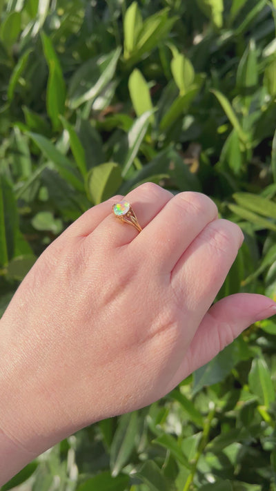 A vibrant opal cabochon rests atop a tall ornate mounting in this vintage 14k gold ring. The watery gem has that ethereal jelly-like quality that ignites soft washes of color. The split shoulders feature subdued chunky floral elements, and the undergallery at the north and south edge of the setting have charming little filigree designs.